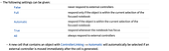 False never respond to external controllers Full respond only if the object is within the current selection of the focused notebook Automatic respond if the object is within the current selection of the focused notebook True respond whenever the notebook has focus All always respond to external controllers - A new cell that contains an object with ControllerLinking->Automatic will automatically be selected if an external controller is moved immediately after the cell is generated.