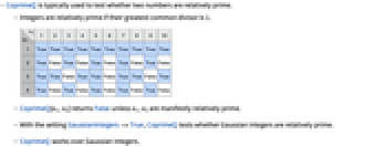 - With the setting GaussianIntegers->True, CoprimeQ tests whether Gaussian integers are relatively prime.