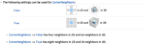 - CornerNeighbors->True has eight neighbors in 2D and 26 neighbors in 3D.