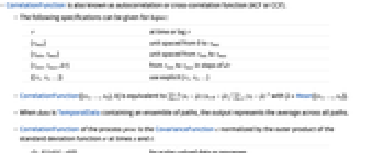 τ at time or lag τ {τmax} unit spaced from 0 to τmax {τmin,τmax} unit spaced from τmin to τmax {τmin,τmax,dτ} from τmin to τmax in steps of dτ {{τ1,τ2,…}} use explicit {τ1,τ2,…} - CorrelationFunction[{x1,…,xn},h] is equivalent to