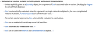 - Unless explicitly given as a Quantity object, the argument of Cos is assumed to be in radians. (Multiply by Degree to convert from degrees.) »