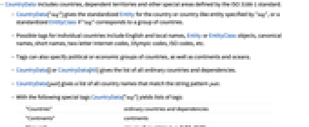 - With the following special tags CountryData["tag"] yields lists of tags: