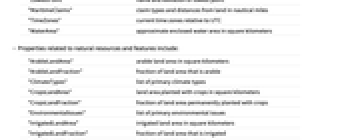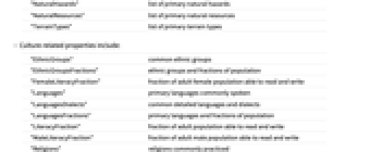 "ArableLandArea" arable land area in square kilometers "ArableLandFraction" fraction of land area that is arable "ClimateTypes" list of primary climate types "CropsLandArea" land area planted with crops in square kilometers "CropsLandFraction" fraction of land area permanently planted with crops "EnvironmentalIssues" list of primary environmental issues "IrrigatedLandArea" irrigated land area in square kilometers "IrrigatedLandFraction" fraction of land area that is irrigated "NaturalHazards" list of primary natural hazards "NaturalResources" list of primary natural resources "TerrainTypes" list of primary terrain types - Culture-related properties include: