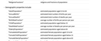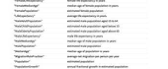 "AdultPopulation" estimated population aged 15 to 64 "AnnualBirths" estimated total number of births per year "AnnualDeaths" estimated total number of deaths per year "BirthRateFraction" average number of births per person per year "ChildPopulation" estimated population aged below 15 "DeathRateFraction" average number of deaths per person per year "ElderlyPopulation" estimated population aged above 65 "FemaleAdultPopulation" estimated female population aged 15 to 64 "FemaleChildPopulation" estimated female population aged below 15 "FemaleElderlyPopulation" estimated female population aged above 65 "FemaleLifeExpectancy" female life expectancy in years "FemaleMedianAge" median age of female population in years "FemalePopulation" estimated female population "LifeExpectancy" average life expectancy in years "MaleAdultPopulation" estimated male population aged 15 to 64 "MaleChildPopulation" estimated male population aged below 15 "MaleElderlyPopulation" estimated male population aged above 65 "MaleLifeExpectancy" male life expectancy in years "MaleMedianAge" median age of male population in years "MalePopulation" estimated male population "MedianAge" median age of population in years "MigrationRateFraction" average net migration per person per year "Population" estimated population "PopulationGrowth" annual fractional growth in estimated population "TotalFertilityRate" lifetime total average number of births per woman - Public health properties include:
