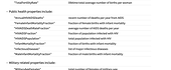 "AnnualHIVAIDSDeaths" recent number of deaths per year from AIDS "FemaleInfantMortalityFraction" fraction of female births with infant mortality "HIVAIDSDeathRateFraction" average number of AIDS deaths per year "HIVAIDSFraction" fraction of population infected with HIV "HIVAIDSPopulation" total population infected with HIV "InfantMortalityFraction" fraction of births with infant mortality "InfectiousDiseases" list of major infectious diseases "MaleInfantMortalityFraction" fraction of male births with infant mortality - Military-related properties include: