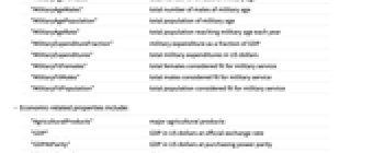 "MilitaryAgeFemales" total number of females of military age "MilitaryAgeMales" total number of males of military age "MilitaryAgePopulation" total population of military age "MilitaryAgeRate" total population reaching military age each year "MilitaryExpenditureFraction" military expenditure as a fraction of GDP "MilitaryExpenditures" total military expenditures in US dollars "MilitaryFitFemales" total females considered fit for military service "MilitaryFitMales" total males considered fit for military service "MilitaryFitPopulation" total population considered fit for military service - Economic-related properties include: