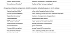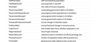 "AgriculturalProducts" major agricultural products "GDP" GDP in US dollars at official exchange rate "GDPAtParity" GDP in US dollars at purchasing power parity "GDPPerCapita" GDP normalized by population "GDPRealGrowth" annual growth in real GDP "GiniIndex" Gini index of income inequality "GovernmentDebt" outstanding government debt in US dollars "GovernmentExpenditures" annual government expenditures in US dollars "GovernmentReceipts" annual government receipts in US dollars "GovernmentSurplus" annual government surplus in US dollars "IndustrialProductionGrowth" annual change in industrial output "InflationRate" annual fractional change in consumer prices "LaborForce" size of adult labor force, whether employed or not "MajorIndustries" list of major industries "NationalIncome" national income in US dollars at official exchange rate "PovertyFraction" fraction of population below official poverty line "PriceIndex" general price index relative to the current year "SectorLaborFractions" fractions of labor force in different sectors "UnemploymentFraction" fraction of labor force unemployed - Properties related to components of GDP include (by default all values are in US dollars):