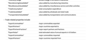 "AgriculturalValueAdded" value added by agricultural activities "ConstructionValueAdded" value added by construction and real estate activities "ExpenditureFractions" fractions of components of expenditure "FixedInvestment" investment in fixed capital "GDPSectorFractions" major sector portions of production "GovernmentConsumption" annual government consumption "GrossInvestment" gross investment "HouseholdConsumption" annual household consumption "IndustrialValueAdded" value added by all industrial activities "InventoryChange" annual change in the value of inventories "ManufacturingValueAdded" value added by manufacturing industries "MiscellaneousValueAdded" value added by miscellaneous service and other activities "TotalConsumption" total consumption expenditure "TradeValueAdded" value added by wholesale and retail trade "TransportationValueAdded" value added by transportation and communications - Trade-related properties include: