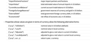 {"prop","USDollars"} nominal value in US dollars (default) {"prop","Local"} nominal value in local currency {"prop","Adjusted"} adjusted to give a real value in current US dollars {"prop","LocalAdjusted"} adjusted to give a real value in current local currency {"prop",curr,y} value in year y currency - Currency-related properties include: