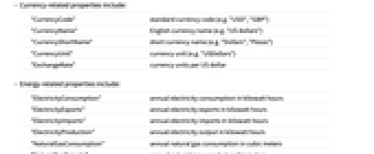 "CurrencyCode" standard currency code (e.g. "USD", "GBP") "CurrencyName" English currency name (e.g. "US dollars") "CurrencyShortName" short currency name (e.g. "Dollars", "Pesos") "CurrencyUnit" currency unit (e.g. "USDollars") "ExchangeRate" currency units per US dollar - Energy-related properties include: