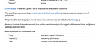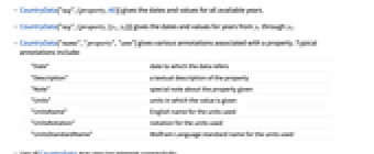- CountryData["name","property","ann"] gives various annotations associated with a property. Typical annotations include:
