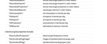 "ElectricityConsumption" annual electricity consumption in kilowatt hours "ElectricityExports" annual electricity exports in kilowatt hours "ElectricityImports" annual electricity imports in kilowatt hours "ElectricityProduction" annual electricity output in kilowatt hours "NaturalGasConsumption" annual natural gas consumption in cubic meters "NaturalGasExports" annual natural gas exports in cubic meters "NaturalGasImports" annual natural gas imports in cubic meters "NaturalGasProduction" annual natural gas production in cubic meters "NaturalGasReserves" natural gas reserves in cubic meters "OilConsumption" oil consumption in barrels per day "OilExports" oil exports in barrels per day "OilImports" oil imports in barrels per day "OilProduction" oil production in barrels per day "OilReserves" estimated oil reserves in barrels - Electrical grid properties include:
