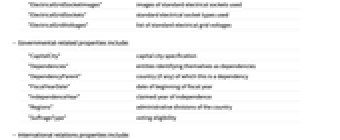 "CapitalCity" capital city specification "Dependencies" entities identifying themselves as dependencies "DependencyParent" country (if any) of which this is a dependency "FiscalYearDate" date of beginning of fiscal year "IndependenceYear" claimed year of independence "Regions" administrative divisions of the country "SuffrageType" voting eligibility - International relations properties include: