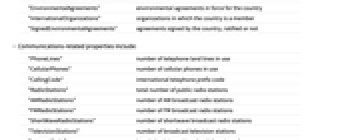 "PhoneLines" number of telephone land lines in use "CellularPhones" number of cellular phones in use "CallingCode" international telephone prefix code "RadioStations" total number of public radio stations "AMRadioStations" number of AM broadcast radio stations "FMRadioStations" number of FM broadcast radio stations "ShortWaveRadioStations" number of shortwave broadcast radio stations "TelevisionStations" number of broadcast television stations "InternetCode" two-letter internet top-level domain code "InternetHosts" estimated number of internet hosts "InternetUsers" estimated number of internet users - Transportation-related properties include: