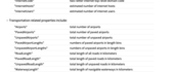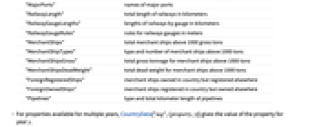 "Airports" total number of airports "PavedAirports" total number of paved airports "UnpavedAirports" total number of unpaved airports "PavedAirportLengths" numbers of paved airports in length bins "UnpavedAirportLengths" numbers of unpaved airports in length bins "RoadLength" total length of all roads in kilometers "PavedRoadLength" total length of paved roads in kilometers "UnpavedRoadLength" total length of unpaved roads in kilometers "WaterwayLength" total length of navigable waterways in kilometers "MajorPorts" names of major ports "RailwayLength" total length of railways in kilometers "RailwayGaugeLengths" lengths of railways by gauge in kilometers "RailwayGaugeRules" rules for railways gauges in meters "MerchantShips" total merchant ships above 1000 gross tons "MerchantShipTypes" type and number of merchant ships above 1000 tons "MerchantShipsGross" total gross tonnage for merchant ships above 1000 tons "MerchantShipsDeadWeight" total dead weight for merchant ships above 1000 tons "ForeignRegisteredShips" merchant ships owned in country but registered elsewhere "ForeignOwnedShips" merchant ships registered in country but owned elsewhere "Pipelines" type and total kilometer length of pipelines - For properties available for multiple years, CountryData["tag",{property,y}] gives the value of the property for year y.
