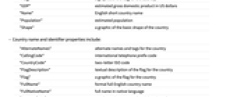 "Area" land area in square kilometers "CapitalCity" capital city specification "Flag" a graphic of the flag for the country "GDP" estimated gross domestic product in US dollars "Name" English short country name "Population" estimated population "Shape" a graphic of the basic shape of the country - Country name and identifier properties include: