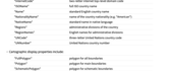 "AlternateNames" alternate names and tags for the country "CallingCode" international telephone prefix code "CountryCode" two-letter ISO code "FlagDescription" textual description of the flag for the country "Flag" a graphic of the flag for the country "FullName" formal full English country name "FullNativeName" full name in native language "InternetCode" two-letter internet top-level domain code "ISOName" full ISO country name "Name" standard English country name "NationalityName" name of the country nationality (e.g. "American") "NativeName" standard name in native language "Regions" administrative divisions of the country "RegionNames" English names for administrative divisions "UNCode" three-letter United Nations country code "UNNumber" United Nations country number - Cartographic display properties include: