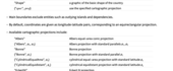 "FullPolygon" polygon for all boundaries "Polygon" polygon for main boundaries "SchematicPolygon" polygon for schematic boundaries "Shape" a graphic of the basic shape of the country {"spec",proj} use the specified cartographic projection - Main boundaries exclude entities such as outlying islands and dependencies.