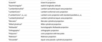 "Albers" Albers equal-area conic projection {"Albers",ϕ1,ϕ2} Albers projection with standard parallels ϕ1, ϕ2 "Bonne" Bonne projection {"Bonne",ϕ1} Bonne projection with standard parallel ϕ1 {"CylindricalEqualArea",ϕs} cylindrical equal-area projection with standard latitude ϕs {"CylindricalEquidistant",ϕs} cylindrical equidistant projection with standard latitude ϕs "EckertIV" Eckert IV projection "EckertVI" Eckert VI projection "Equirectangular" explicit longitude, latitude "LambertAzimuthal" Lambert azimuthal equal-area projection "LambertConic" Lambert conformal conic projection {"LambertConic",ϕ1,ϕ2} Lambert conic projection with standard parallels ϕ1, ϕ2 "LambertCylindrical" Lambert cylindrical equal-area projection "Mercator" Mercator cylindrical projection "MillerCylindrical" Miller cylindrical projection "Mollweide" homolographic Mollweide projection "Orthographic" orthographic projection "Polyconic" conic projection with two poles "Robinson" Robinson projection "Sinusoidal" equal-area pseudo-cylindrical projection "VanDerGrinten" Van der Grinten projection "WinkelTripel" Winkel Tripel projection - The centering of cartographic projections is specified as follows: