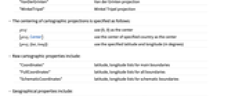 proj use {0,0} as the center {proj,Center} use the center of specified country as the center {proj,{lat,long}} use the specified latitude and longitude (in degrees) - Raw cartographic properties include:
