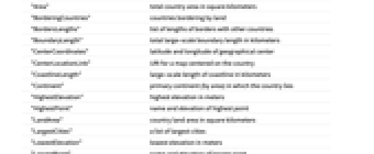 "Area" total country area in square kilometers "BorderingCountries" countries bordering by land "BordersLengths" list of lengths of borders with other countries "BoundaryLength" total large-scale boundary length in kilometers "CenterCoordinates" latitude and longitude of geographical center "CenterLocationLink" URI for a map centered on the country "CoastlineLength" large-scale length of coastline in kilometers "Continent" primary continent (by area) in which the country lies "HighestElevation" highest elevation in meters "HighestPoint" name and elevation of highest point "LandArea" country land area in square kilometers "LargestCities" a list of largest cities "LowestElevation" lowest elevation in meters "LowestPoint" name and elevation of lowest point "MaritimeClaims" claim types and distances from land in nautical miles "TimeZones" current time zones relative to UTC "WaterArea" approximate enclosed water area in square kilometers - Properties related to natural resources and features include: