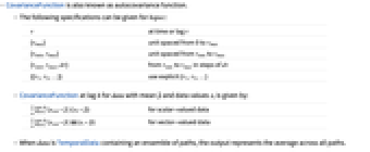 τ at time or lag τ {τmax} unit spaced from 0 to τmax {τmin,τmax} unit spaced from τmin to τmax {τmin,τmax,d τ} from τmin to τmax in steps of d τ {{τ1,τ2,…}} use explicit {τ1,τ2,…} - CovarianceFunction at lag h for data with mean