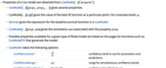 - Possible properties available for a given type of fitted model are listed on the pages for functions such as CoxModelFit that generate the model.