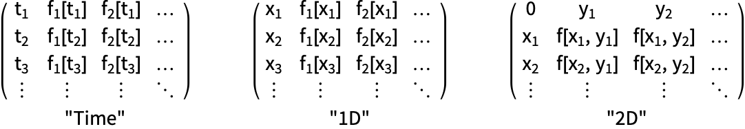 "Time" time column and value columns "1D" argument column and value columns "2D" arguments row and column and value matrix - The corresponding data arrays have the layouts given here: