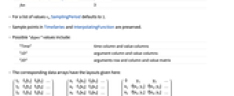 {v1,v2,…},{{t1,v1},…} 1 TimeSeries, InterpolatingFunction preserved fun 3 - For a list of values vi, SamplingPeriod defaults to 1.