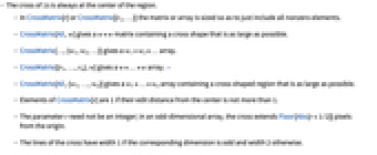 - CrossMatrix[All,w] gives a w×w matrix containing a cross shape that is as large as possible.