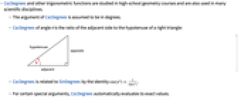 is the ratio of the adjacent side to the hypotenuse of a right triangle: - CscDegrees is related to SinDegrees by the identity