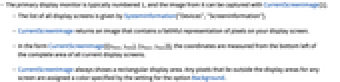- The primary display monitor is typically numbered 1, and the image from it can be captured with CurrentScreenImage[1].