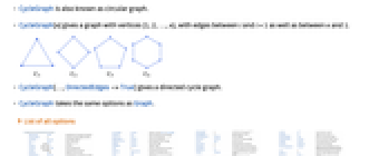 - CycleGraph[n] gives a graph with vertices {1,2,…,n}, with edges between i and i+1 as well as between n and 1.