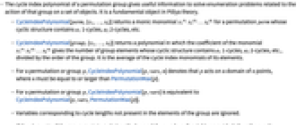 Wolfram Language. (2012). CycleIndexPolynomial. Wolfram Language & System Documentation Center. Retrieved from https://reference.wolfram.com/language/ref/CycleIndexPolynomial.html