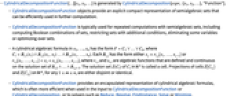 - CylindricalDecompositionFunction is typically used for repeated computations with semialgebraic sets, including computing Boolean combinations of sets, restricting sets with additional conditions, eliminating some variables or optimizing over sets.
