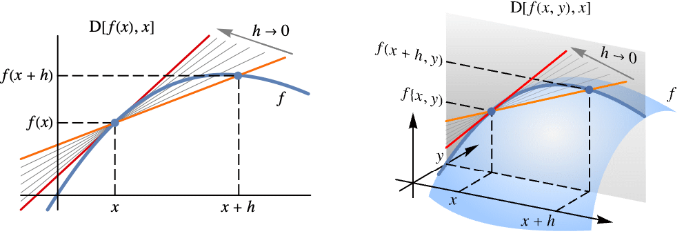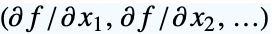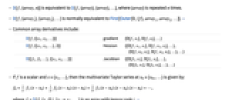 D[f,{{x1,x2,…}}] gradient {D[f,x1],D[f,x2],…} D[f,{{x1,x2,…},2}] Hessian {{D[f,x1,x1],D[f,x1,x2],…},{D[f,x2,x1],D[f,x2,x2],…},…} D[{f1,f2,…},{{x1,x2,…}}] Jacobian {{D[f1,x1],D[f1,x2],…},