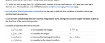 . » - If f and x are both arrays, then D[f,{x}] effectively threads first over each element of f, and then over each element of x. The result is an array with dimensions Join[Dimensions[f],Dimensions[x]]. »