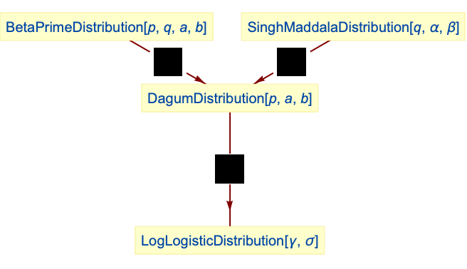 - The Dagum distribution is related to a number of other distributions. For example, DagumDistribution is a special case of BetaPrimeDistribution in the sense that the PDF of BetaPrimeDistribution[p,1,a,b] is precisely the same as the PDF of DagumDistribution[p,a,b]. DagumDistribution also generalizes the more specific LogLogisticDistribution, i.e. DagumDistribution[1,γ,σ] has the same PDF as LogLogisticDistribution[λ,σ] and is constructed to combine the qualitative features of both LogNormalDistribution and ParetoDistribution. DagumDistribution is the inverse of the Burr/Singh–Maddala distribution (SinghMaddalaDistribution) and is also related to BeniniDistribution, GammaDistribution, and WeibullDistribution.