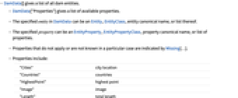 "Entities" all available entities "EntityCount" total number of available entities "Classes" all available entity classes "EntityClassCount" total number of available entity classes "SampleEntities" list of sample entities "SampleEntityClasses" list of sample entity classes "EntityCanonicalNames" list of all entity canonical names "PropertyCanonicalNames" list of all property canonical names "EntityClassCanonicalNames" list of all entity class canonical names "RandomEntities" pseudorandom sample entities {"RandomEntities",n} n pseudorandom entities "RandomEntityClasses" pseudorandom sample entity classes {"RandomEntityClasses",n} n pseudorandom entity classes - The following annotations can be used in the third argument of DamData[entity,property,annotation]: