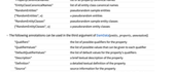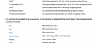 "Qualifiers" the list of possible qualifiers for the property "QualifierValues" the list of possible values that can be given to each qualifier "DefaultQualifierValues" the list of default values for the property's qualifiers "Description" a brief textual description of the property "Definition" a detailed textual definition of the property "Source" source information for the property "Date" the date associated with the entity-property value (if any) "PhysicalQuantity" the physical quantity associated with the entity-property value "Unit" the unit associated with the entity-property value "EntityAssociation" an association of entities and entity-property values "PropertyAssociation" an association of properties and entity-property values - If a function is provided as an annotation, it will be used to aggregate the result data. Typical aggregation functions include: