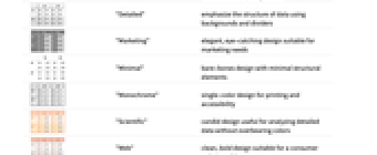 "VerticalColumnHeaders" orient column header text vertically - Background and divider feature themes can be parameterized with style information.