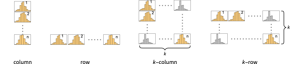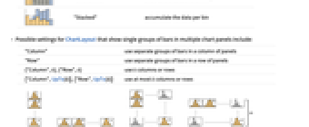 "Column" use separate groups of bars in a column of panels "Row" use separate groups of bars in a row of panels {"Column",k},{"Row",k} use k columns or rows {"Column",UpTo[k]},{"Row",UpTo[k]} use at most k columns or rows - The arguments supplied to ChartElementFunction are the bin region {{xmin,xmax},{ymin,ymax}}, the bin values lists, and metadata {m1,m2,…} from each level in a nested list of datasets.