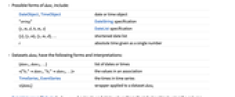 DateObject,TimeObject date or time object "string" DateString specification {y,m,d,h,m,s} DateList specification {y},{y,m},{y,m,d},… shortened date list t absolute time given as a single number - Datasets datai have the following forms and interpretations: