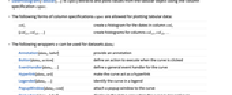 Annotation[datai,label] provide an annotation Button[datai,action] define an action to execute when the curve is clicked EventHandler[datai,…] define a general event handler for the curve Hyperlink[datai,uri] make the curve act as a hyperlink Legended[datai,…] identify the curve in a legend PopupWindow[datai,cont] attach a popup window to the curve StatusArea[datai,label] display in the status area when the curve is moused over Style[datai,opts] show the curve using the specified styles Tooltip[datai,label] attach an arbitrary tooltip to the curve - The following bin width specifications bspec can be given: