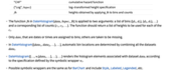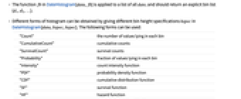 "Count" the number of values lying in each bin "CumulativeCount" cumulative counts "SurvivalCount" survival counts "Probability" fraction of values lying in each bin "Intensity" count intensity function "PDF" probability density function "CDF" cumulative distribution function "SF" survival function "HF" hazard function "CHF" cumulative hazard function {"Log",hspec} log-transformed height specification fh heights obtained by applying fh to bins and counts - The function fh in DateHistogram[data,bspec,fh] is applied to two arguments: a list of bins {{d1,d2},{d2,d3},…} and a corresponding list of counts {c1,c2,…}. The function should return a list of heights to be used for each of the ci.