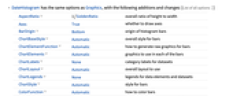 AlignmentPoint Center the default point in the graphic to align with AspectRatio 1/GoldenRatio overall ratio of height to width Axes True whether to draw axes AxesLabel None axes labels AxesOrigin Automatic where axes should cross AxesStyle {} style specifications for the axes Background None background color for the plot BarOrigin Bottom origin of histogram bars BaselinePosition Automatic how to align with a surrounding text baseline BaseStyle {} base style specifications for the graphic ChartBaseStyle Automatic overall style for bars ChartElementFunction Automatic how to generate raw graphics for bars ChartElements Automatic graphics to use in each of the bars ChartLabels None category labels for datasets ChartLayout Automatic overall layout to use ChartLegends None legends for data elements and datasets ChartStyle Automatic style for bars ColorFunction Automatic how to color bars ColorFunctionScaling True whether to normalize arguments to ColorFunction ContentSelectable Automatic whether to allow contents to be selected CoordinatesToolOptions Automatic detailed behavior of the coordinates tool DateFunction Automatic how to convert dates to standard form DateReduction None what cyclic period of time to use DateTicksFormat Automatic format for date tick labels Epilog {} primitives rendered after the main plot FormatType TraditionalForm the default format type for text Frame False whether to put a frame around the plot FrameLabel None frame labels FrameStyle {} style specifications for the frame FrameTicks Automatic frame ticks FrameTicksStyle {} style specifications for frame ticks GridLines None grid lines to draw GridLinesStyle {} style specifications for grid lines ImageMargins 0. the margins to leave around the graphic ImagePadding All what extra padding to allow for labels etc. ImageSize Automatic the absolute size at which to render the graphic LabelingFunction Automatic how to label elements LabelStyle {} style specifications for labels LegendAppearance Automatic overall appearance of legends Method Automatic details of graphics methods to use PerformanceGoal $PerformanceGoal aspects of performance to try to optimize PlotLabel None an overall label for the plot PlotRange All range of values to include PlotRangeClipping False whether to clip at the plot range PlotRangePadding Automatic how much to pad the range of values PlotRegion Automatic the final display region to be filled PlotTheme $PlotTheme overall theme for the histogram PreserveImageOptions Automatic whether to preserve image options when displaying new versions of the same graphic Prolog {} primitives rendered before the main plot RotateLabel True whether to rotate y labels on the frame Ticks Automatic axes ticks TicksStyle {} style specifications for axes ticks TimeZone Automatic time zone to use