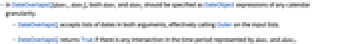 - DateOverlapsQ returns True if there is any intersection in the time period represented by date1 and date2.