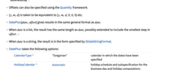 CalendarType "Gregorian" calendar in which the dates have been specified HolidayCalendar Automatic holiday schedule and subspecification for the business day and holiday computations Method Automatic date arithmetic method to use - For added time steps with variable duration (e.g. "Month"), date arithmetic can either convert the steps into a physical duration (continuous arithmetic) or treat them all as discrete calendar steps (discrete arithmetic).