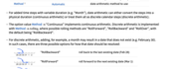 - For discrete arithmetic, adding, for example, a month may result in a date that does not exist (e.g. February 30). In such cases, there are three possible options for how that date should be resolved: