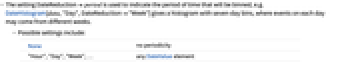 - The setting DateReductionperiod is used to indicate the period of time that will be binned, e.g. DateHistogram[data,"Day",DateReduction"Week"] gives a histogram with seven-day bins, where events on each day may come from different weeks.